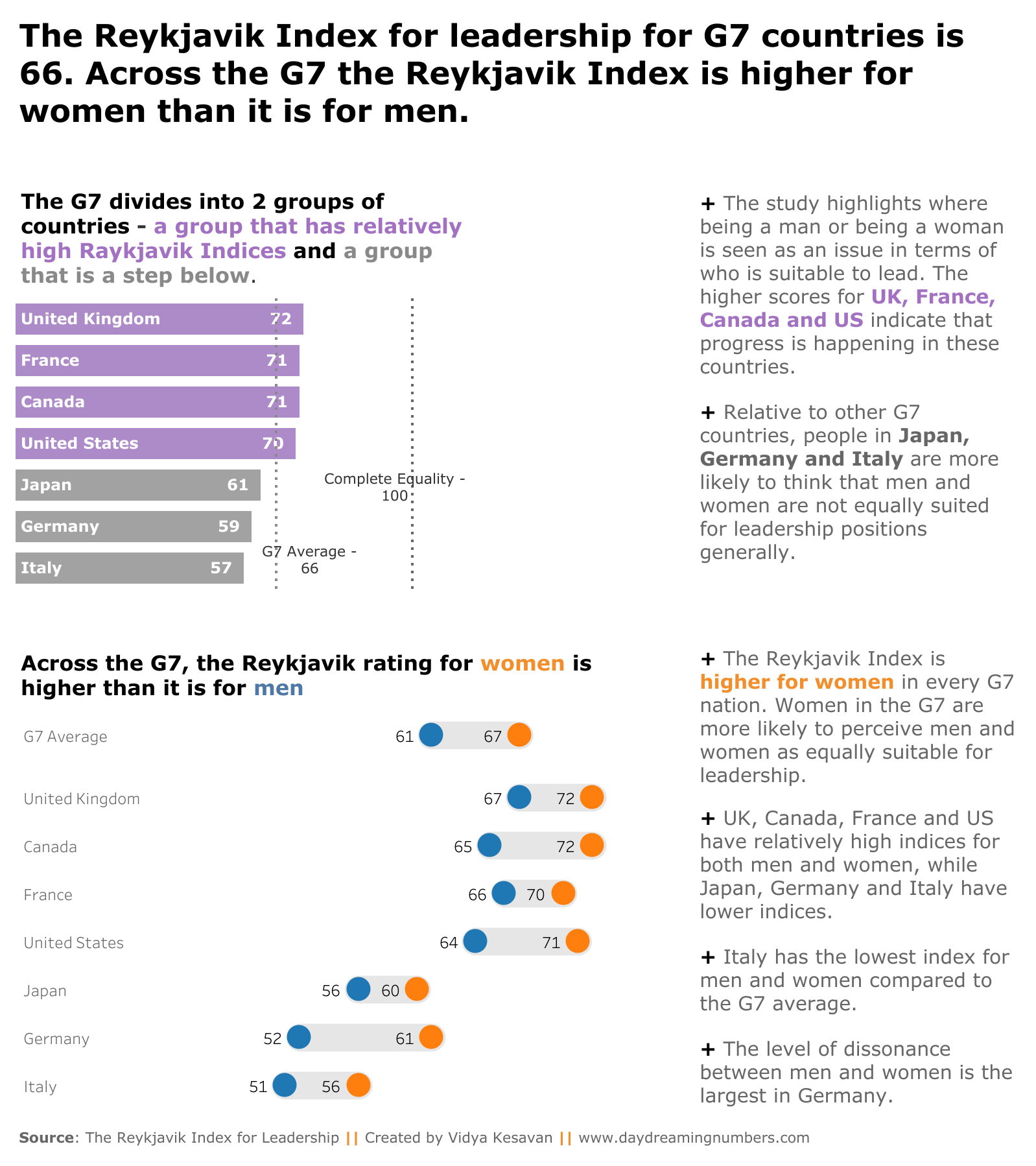 The result: Individual country performance and progress toward gender parity become instantly comparable. The redesign immediately reveals that the Reykjavik Index is higher for women (67) than for men (61) across the G7, meaning women are more likely to view men and women as equally suitable for leadership.
